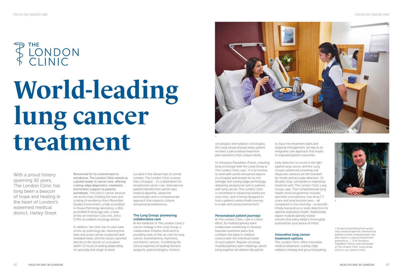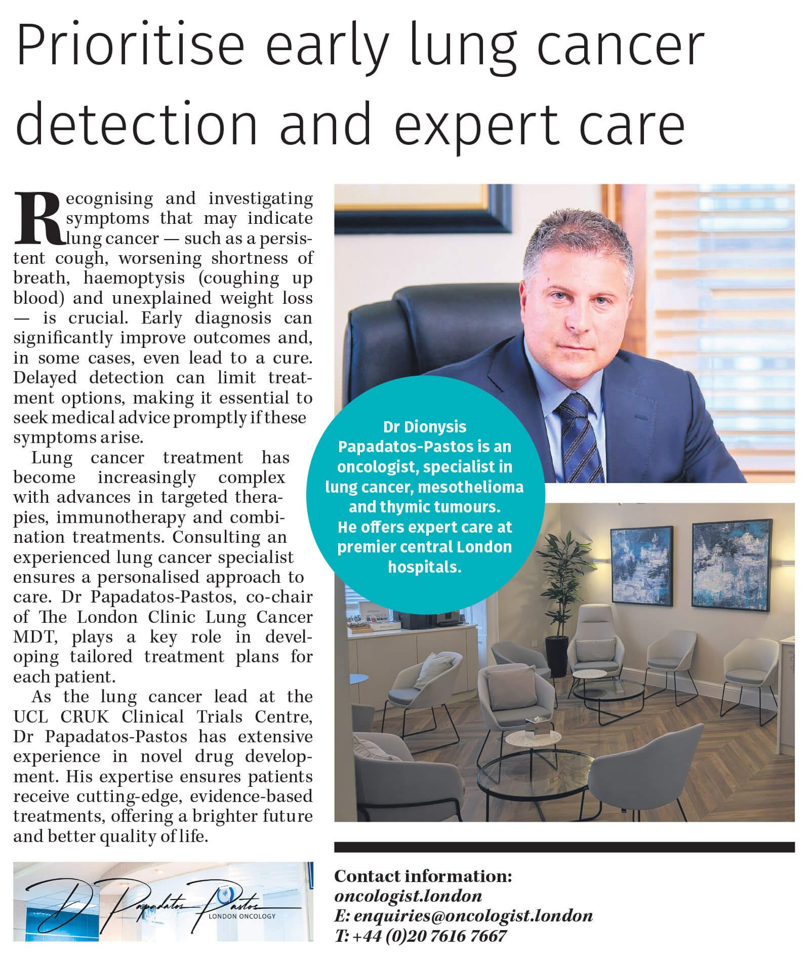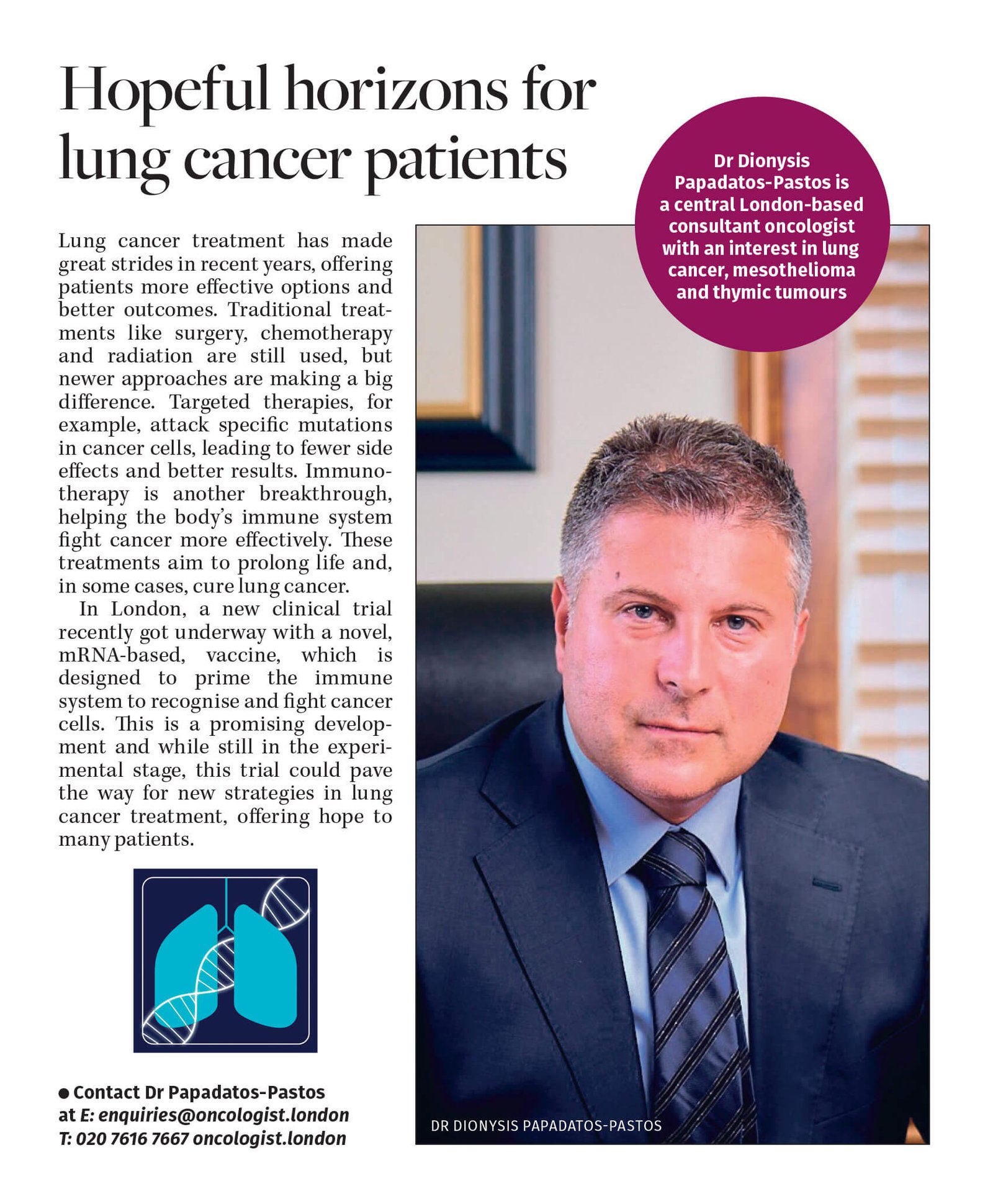 Dr Dionysis Papadatos-Pastos was featured in the seventh edition of Healthcare in London, highlighting the benefits of receiving cancer treatment in London through a collaborative, specialist-led approach. The article showcases the multidisciplinary team treating lung cancer, mesothelioma, and thymic tumours using advanced systemic therapies and local treatments for oligometastatic disease.